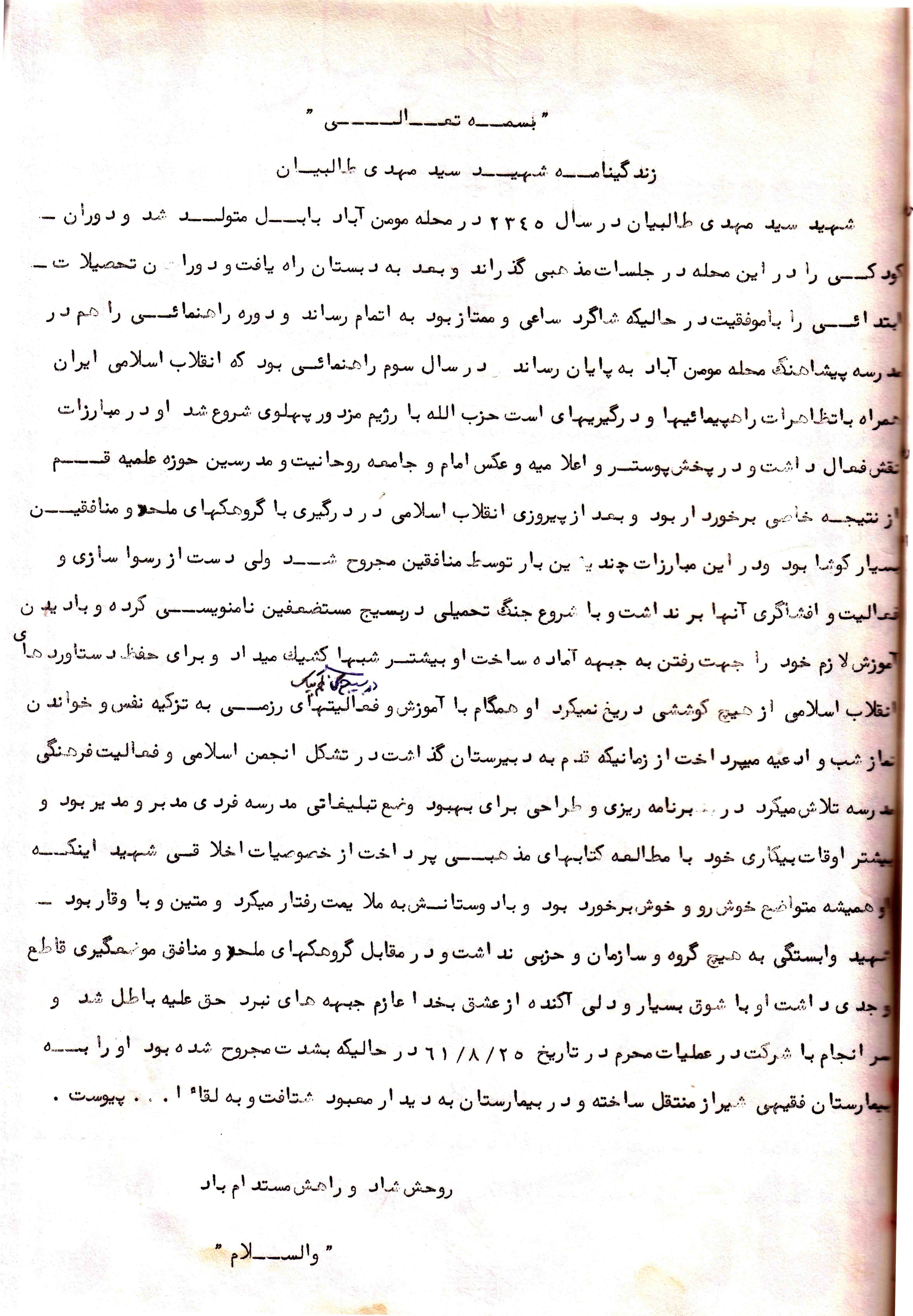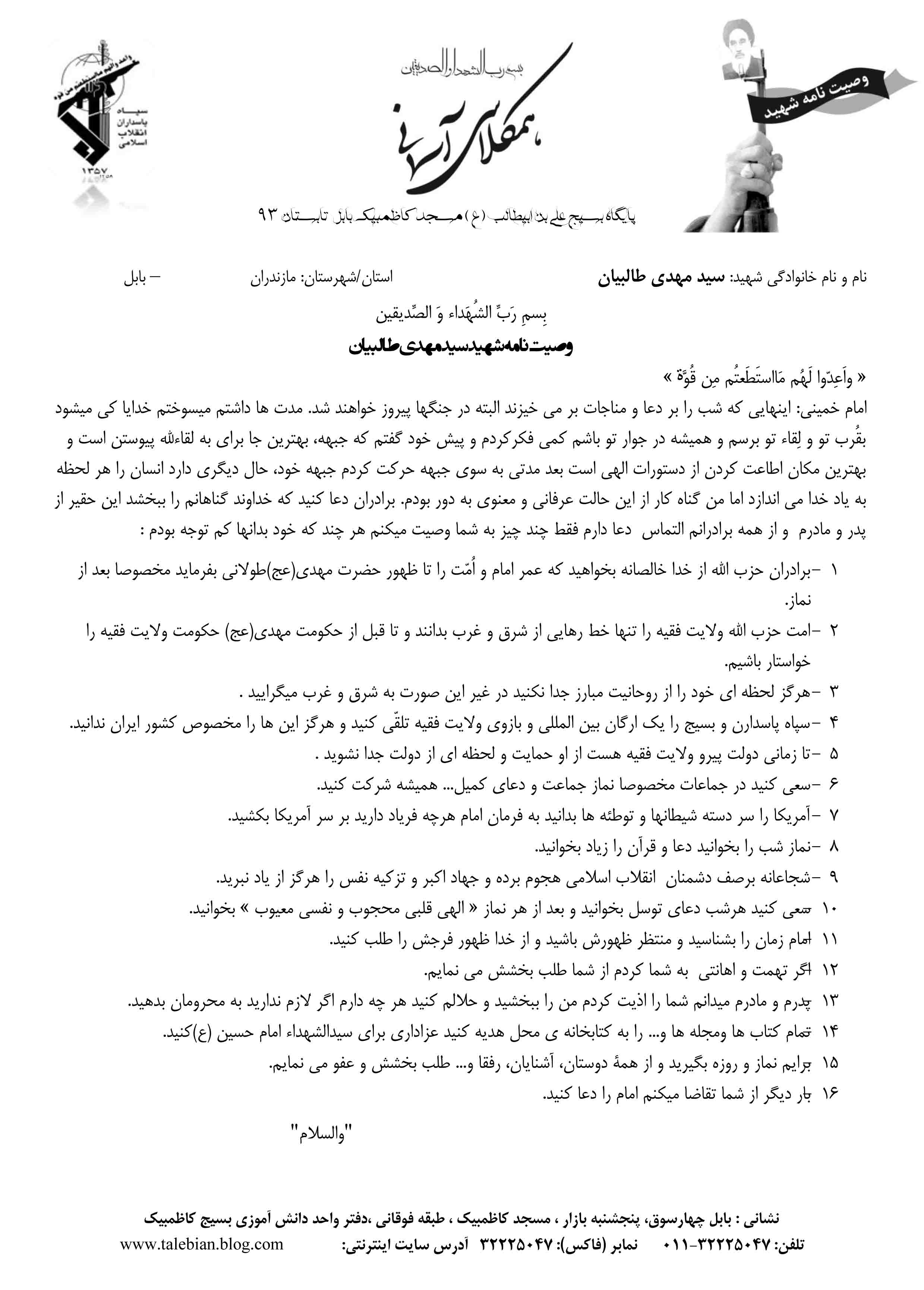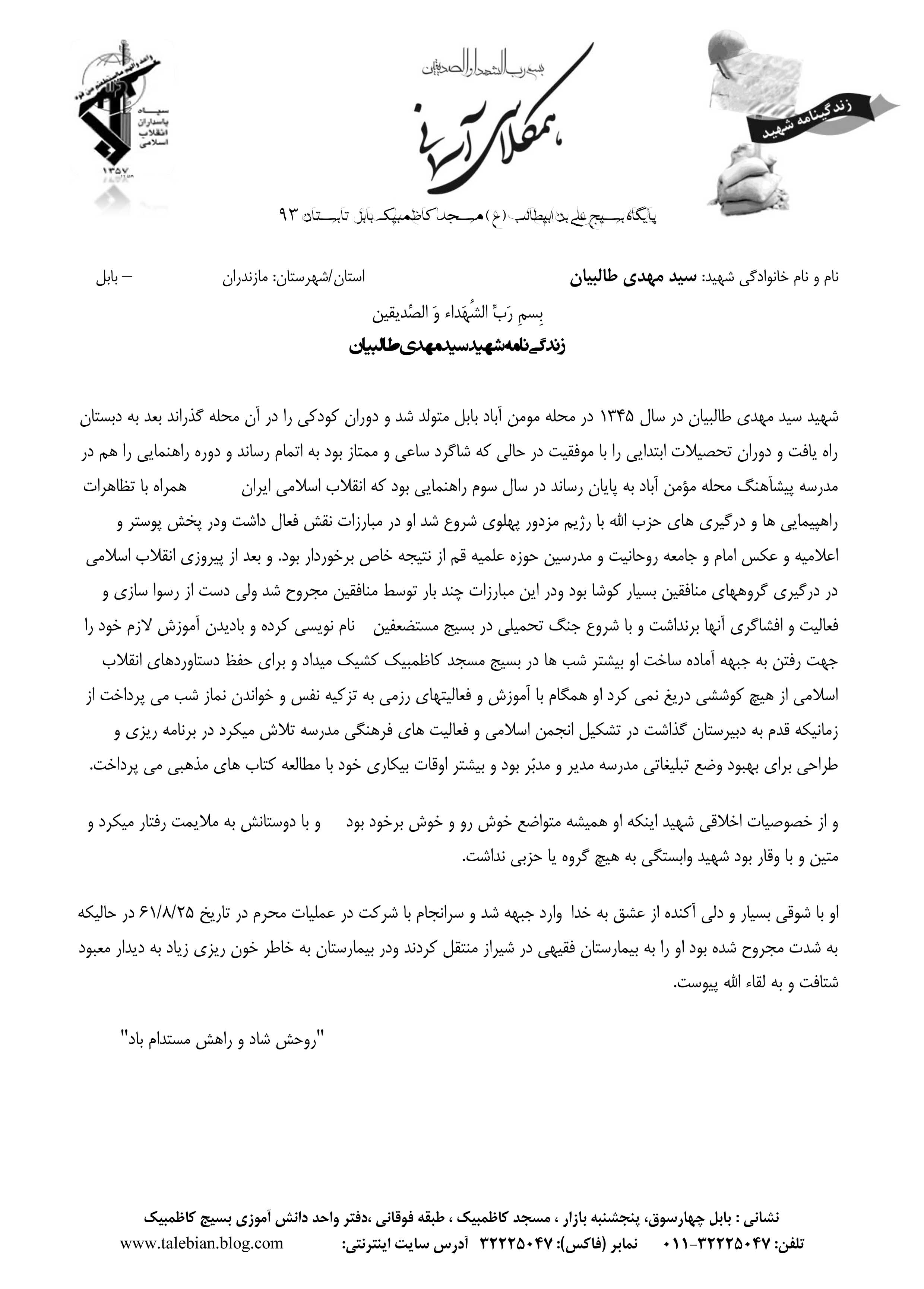سرگذشت پژوهی شهید سید مهدی طالبیان - تابستان ۹۳ - پایگاه بسیج علی بن ابیطالب ع مسجد کاظمبیک بابل - شادی روح شهید صلوات -